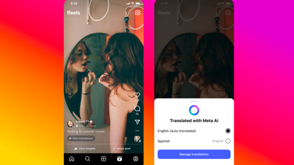 كما سيقوم كل من فيسبوك وإنستغرام بعرض مقاطع الريلز المُترجمة تلقائيًا للمستخدمين باللغة التي يفضلونها، وستحمل مقاطع الفيديو هذه علامة توضح أنها تمت ترجمتها باستخدام تقنية Meta AI.