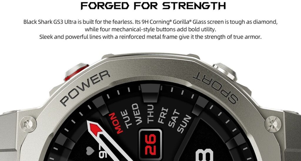 تتميز ساعة GS3 Ultra من بلاك شارك بإطار معدني مُعزز، وأربعة أزرار ميكانيكية، وشاشة AMOLED دائرية مقاس 1.43 بوصة بدقة 466 × 466 بكسل وسطوع 1000 شمعة.