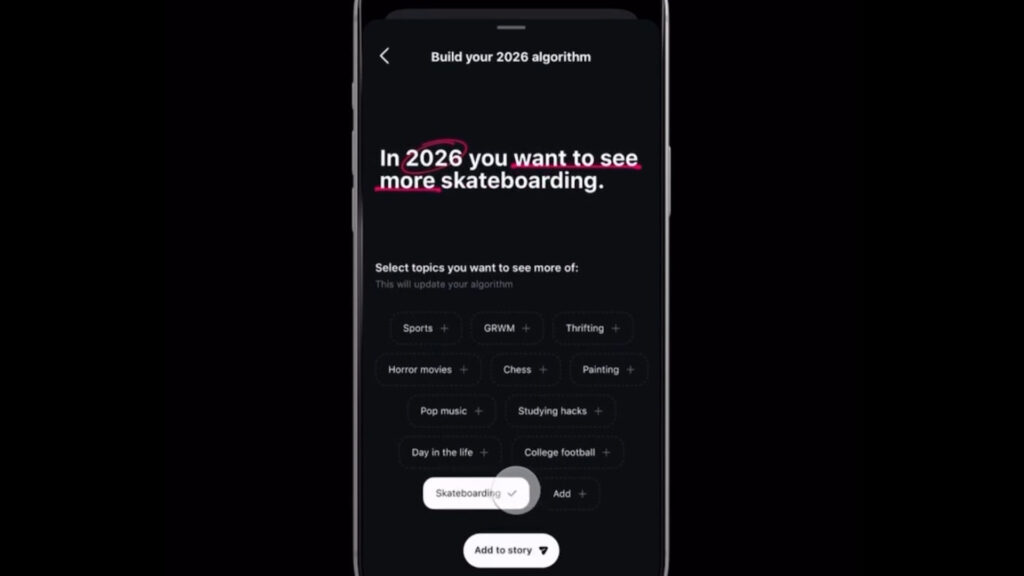 كما يوجد حقل منفصل لتحديد المواضيع التي يرغب في رؤيتها بشكل أقل، وخيار جديد بعنوان “ابتكر خوارزمية 2026” يتيح تحديد ثلاثة مواضيع بعينها.