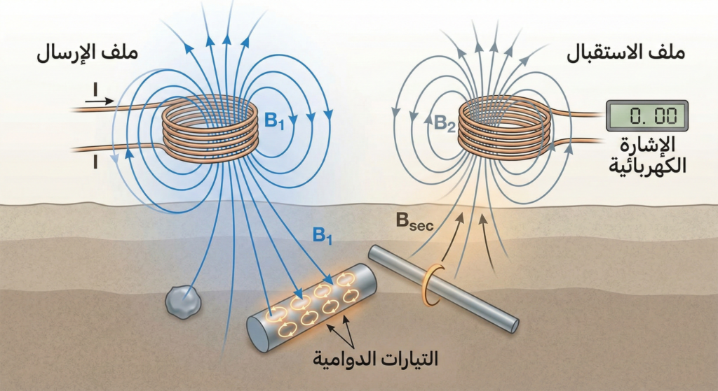 عندما يصطدم هذا المجال بجسم معدني موصل تحت الأرض، يتولد تيار كهربائي دوامي (Eddy Current) داخل المعدن نفسه. هذا التيار يولد بدوره مجالاً مغناطيسياً عكسياً ضعيفاً يلتقطه ملف الاستقبال (Receiver Coil) في الجهاز. وقد تطورت هذه التقنية لتشمل أنظمة الترددات المتعددة المتزامنة (Multi-Frequency)، حيث تقوم الأجهزة الحديثة ببث عدة ترددات في وقت واحد (من المنخفضة جداً إلى المرتفعة) لتحليل الأهداف بعمق ودقة في نفس اللحظة.