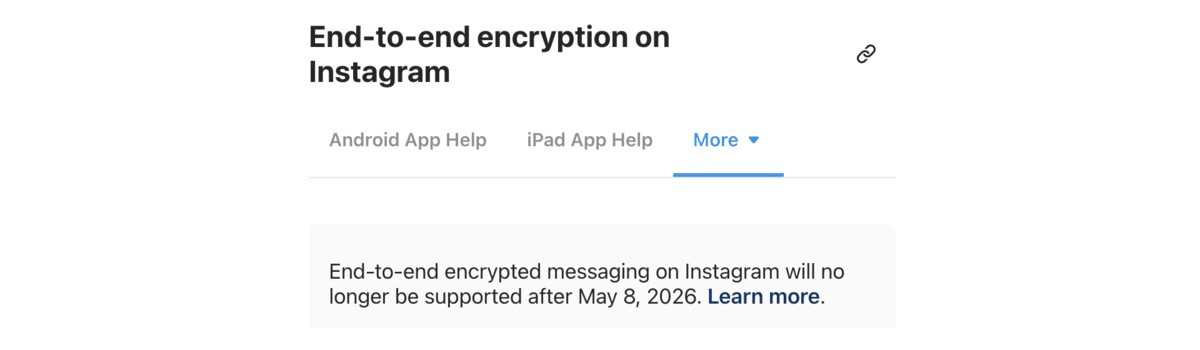 بل قامت ببساطةٍ بتحديث قسم المساعدة ليُشير إلى أن التشفير التام بين الطرفين لن يكون مدعومًا بعد 8 مايو/أيار القادم.