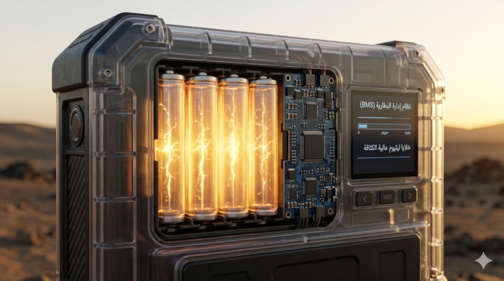 التحدي الثاني الذي يواجه المهندسين هو توفير طاقة كافية لتشغيل شاشات ملونة ساطعة ومعالجات إشارات قوية (DSP) لفترات طويلة في مناطق نائية. الحل جاء عبر دمج بطاريات الليثيوم أيون (Li-ion) ذات الكثافة العالية، المدعومة بأنظمة إدارة بطارية (BMS) ذكية.